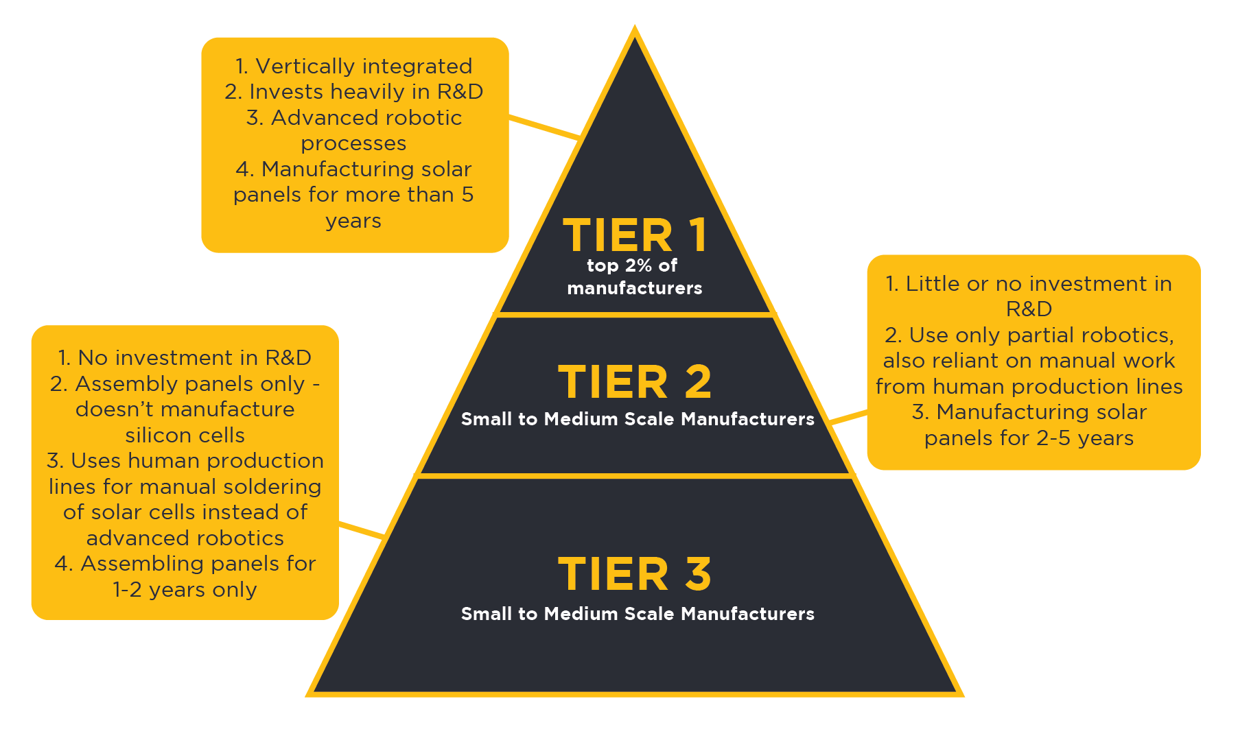 Bij het bepalen van de “Tiers” wordt o.a. gelet op hoeveel geld dat een bedrijf investeert in onderzoek en ontwikkeling. Hoe hoger de investering, hoe meer dat aangeeft dat een bedrijf bezig is met het verbeteren van zijn panelen voor de toekomst.